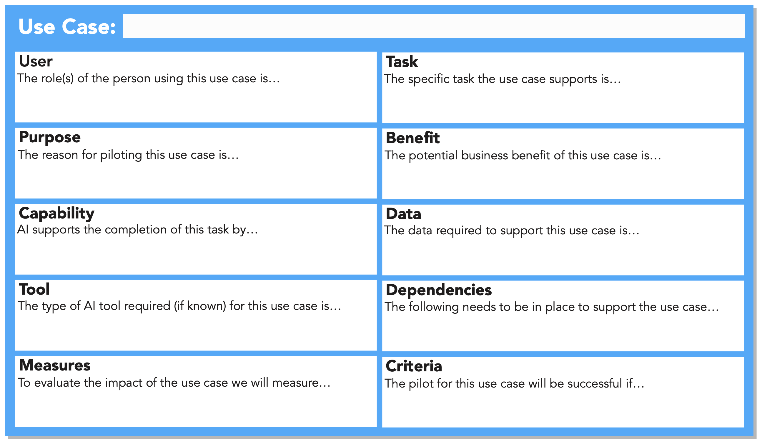 Before organizations adopt AI, they must understand exactly what they are adopting (and why). This is especially true in wild-west environments where people are trying out a whole whack of different tools. After all, the goal isn't to adopt AI; it's to improve outcomes with it. The following template can be used to document your potential AI use cases, including what metrics to use to determine whether the pilot was successful.